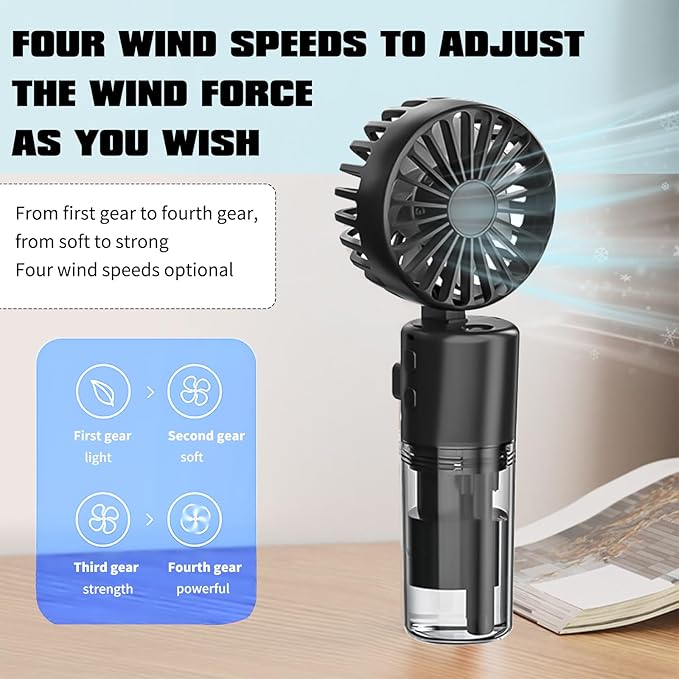 ⚙️ 4 Adjustable Speeds: Choose from 4 wind levels; long press for 3 seconds to activate or stop misting.
